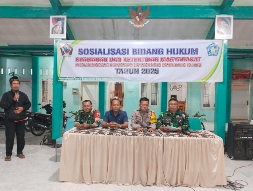 Bendosari, Sanankulon – Pemerintah Desa Bendosari menyelenggarakan kegiatan sosialisasi bidang hukum, keamanan, dan ketertiban masyarakat pada hari Rabu, tanggal 6 Agustus 2025 bertempat di Balai Desa Bendosari. Kegiatan ini bertujuan untuk meningkatkan kesadaran hukum masyarakat serta memperkuat peran warga dalam menjaga keamanan dan ketertiban di lingkungan desa.